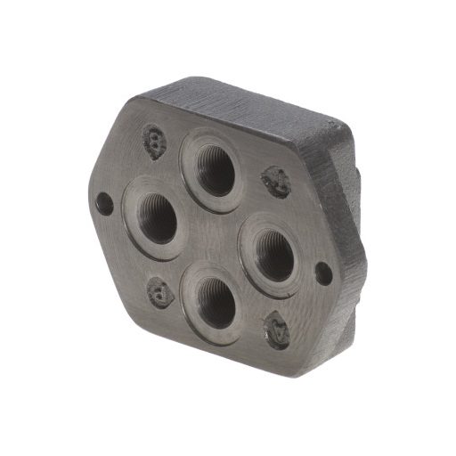 The PBKV-6-38TV is a cast steel subplate designed for NG6 directional control valves, with P and T ports in vertical (top) configuration – which in many cases allows a more favorable piping arrangement. The A and B work ports are also positioned vertically. The 3/8" BSP thread size fits the most commonly used piping systems, with a maximum operating pressure of 350 bar. The design is without a pressure relief valve, so system pressure protection can be achieved with an external element. The subplate directly accepts the NG6 standard directional control valve, with M5 mounting bolts.