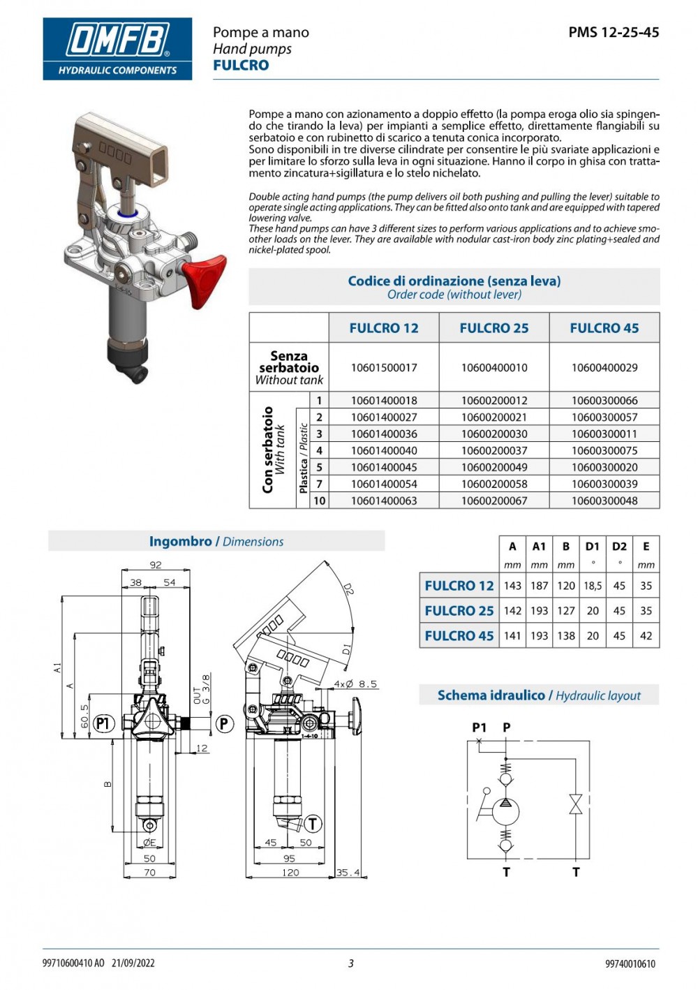 The 10600400010 is an OMFB-manufactured PMS FULCRO 25 type, double-acting hand pump body for single-acting cylinders, designed for mounting on an existing tank — supplied without tank and lever. The pump delivers oil on both pull and push strokes by moving the lever in both directions, and is fitted with a conical drain valve. Its full stroke displacement is 25 cm³ and the maximum pressure setting is 300 bar. It can be fitted with three different levers for various applications, and is ideal as an emergency manual control lever for hydraulic power units with single-acting hydraulic cylinders. The housing is made of ductile cast iron with zinc coating and seal, and the piston rod is nickel-plated.