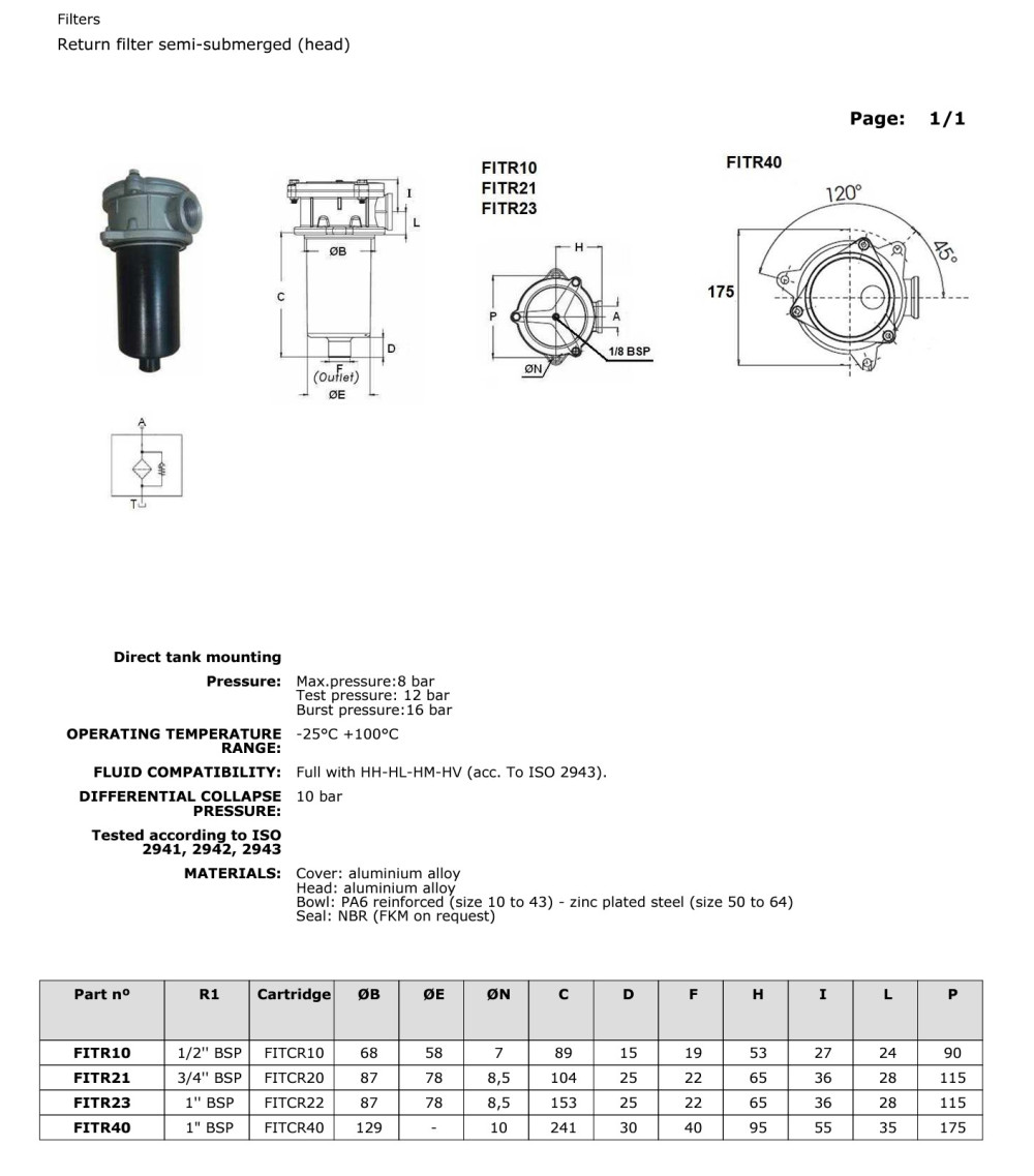 This is a directly tank-mounted, semi-immersed hydraulic return-line filter head with 1/2" BSP connection. The product is compatible with FITCR10 filter element, has a maximum operating pressure of 8 bar, test pressure of 12 bar, and burst pressure of 16 bar. Suitable for HH, HL, HM and HV hydraulic fluids per ISO 2943, with an operating temperature range of -25 °C – +100 °C.