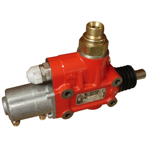 The valve is controlled by a pneumatic signal, which actuates an internal spool to direct hydraulic oil to either the lift or lower circuit. In the neutral position, all ports are closed, preventing unintended movement. An integrated pressure relief valve protects the system from overload, and optional add-ons like a pressure switch or stroke sensor can enhance control.
