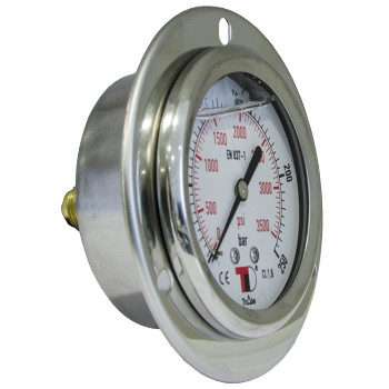 This pressure gauge operates using a Bourdon tube mechanism: as internal pressure increases, the curved tube flexes. This motion is mechanically transmitted to the pointer, which moves across the dial to indicate the pressure value.