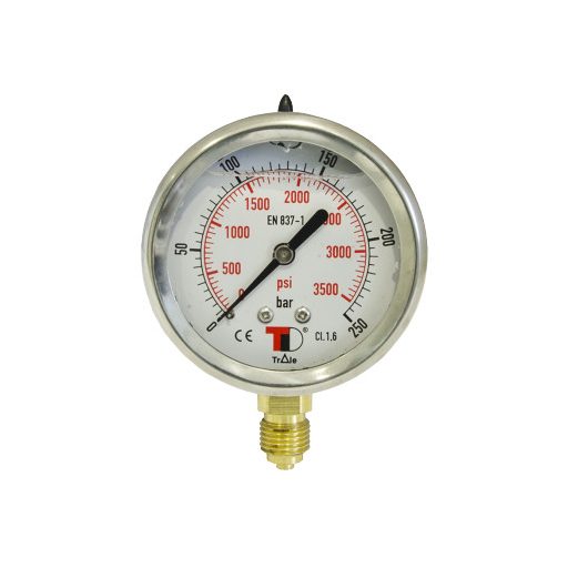 This is a DN 63 diameter, bottom (vertical) connection, glycerine-filled pressure gauge with 1/4" BSP threaded connection. The glycerine filling dampens vibrations and pressure spikes, providing more stable and accurate readability in hydraulic systems and industrial applications. The instrument features a dual bar/psi scale and IP65 protection rating, ensuring reliable operation even in dusty or wet environments.