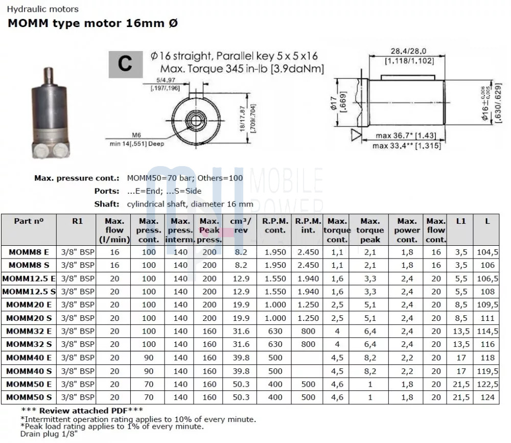 The MOMM8 S is an extremely compact, low-displacement hydraulic motor, ideal for light-duty applications such as small machinery, feeder systems, and positioning mechanisms. The 16 mm shaft provides precise and reliable torque transmission, while the motor’s durable construction ensures long-term operational safety. The “S” designation refers to the side ports, equipped with 3/8” BSP connections. With a displacement of 8.2 cm³/rev, this motor is capable of high rotational speeds, making it a perfect choice for fast-operating hydraulic systems.